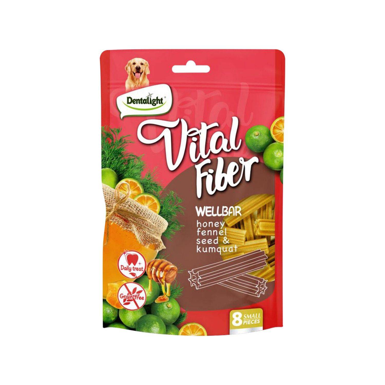 Dentalight Vital Fiber Brush Berries es un snack para perros que ayuda a consentir y al cuidado dental de tu mascota. Esta golosina para perros un Snack especial para el cuidado dental de tu mascota con sabor a miel semillas de hinojo naranja y chia